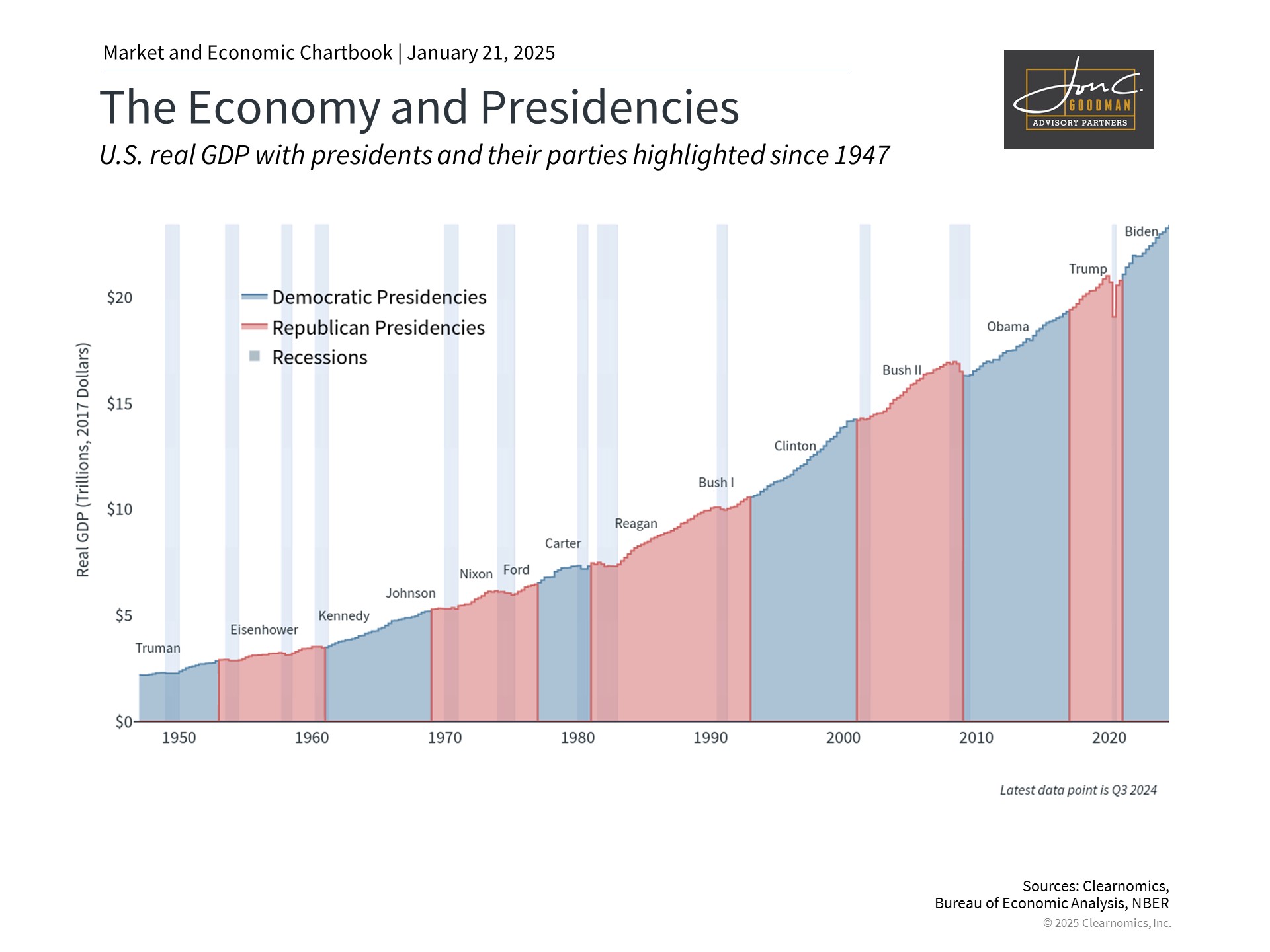 Presidential influence on markets and the economy often receives disproportionate attention. Historical data shows growth periods across administrations of both parties, reflecting broader economic cycles beyond political control.