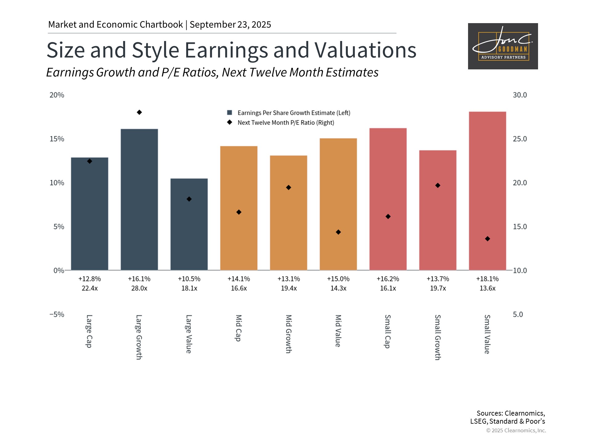 Although broad market valuations appear elevated, more attractive opportunities exist elsewhere. The chart illustrates that Large Cap Growth stocks carry the highest price-to-earnings ratio at 28x. Other market segments, including Large Value and Small Cap stocks, offer more appealing valuations while maintaining healthy earnings growth.