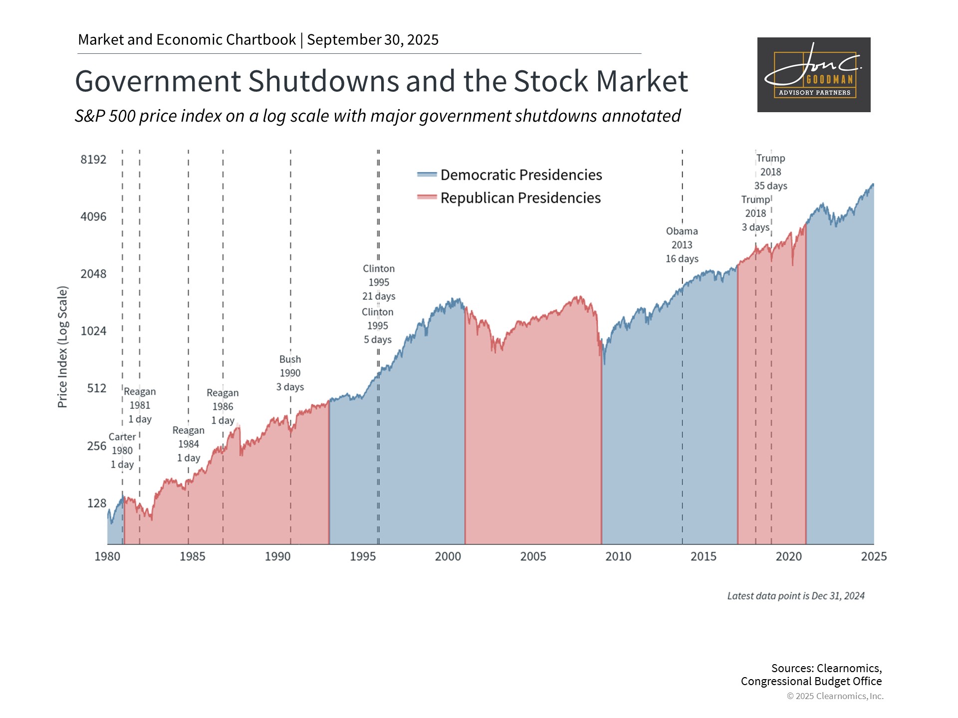 The accompanying chart reveals that government shutdowns have been a recurring feature since 1980 across administrations from both political parties, with limited lasting effects on financial markets. The data shows this held true even during highly contentious episodes, including those during the Reagan years, Clinton’s 21-day shutdown in 1995, Obama’s 16-day shutdown in 2013, and Trump’s record-breaking 35-day shutdown spanning late 2018 to early 2019. From an investment perspective, shutdowns have typically represented brief interruptions rather than significant threats to economic expansion.