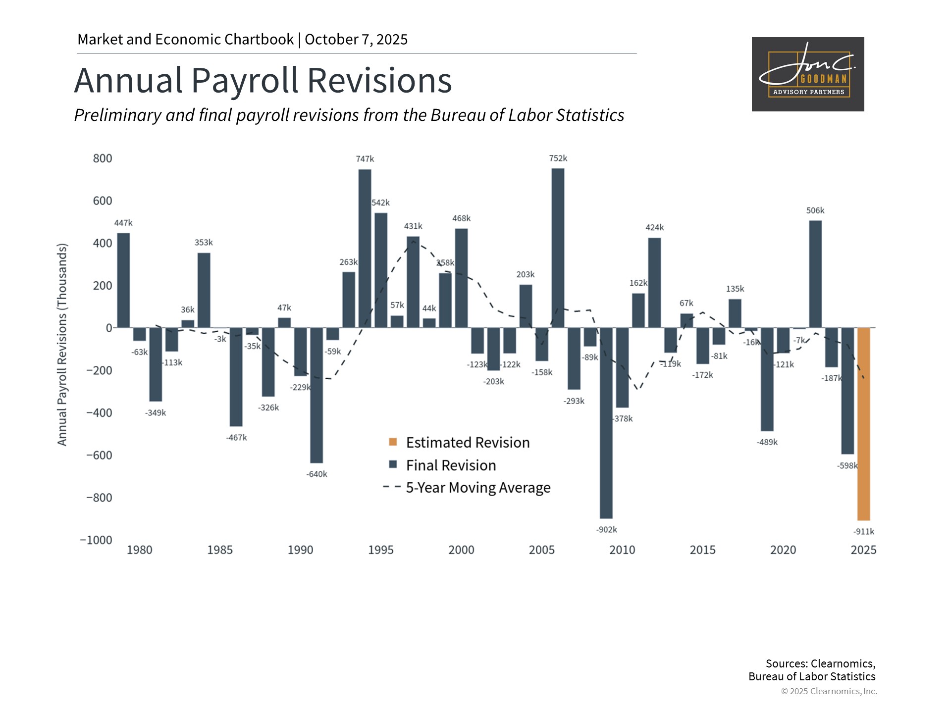 Even more remarkable are payroll revisions indicating that 911,000 fewer jobs were created during the twelve months ending in March than initially reported, as illustrated in the accompanying chart. The Bureau of Labor Statistics annually revises payroll figures based on more comprehensive data than available during initial monthly releases. Although these numbers remain preliminary, a revision of this scale would be historically unprecedented, revealing that labor market conditions have been weaker than previously understood.