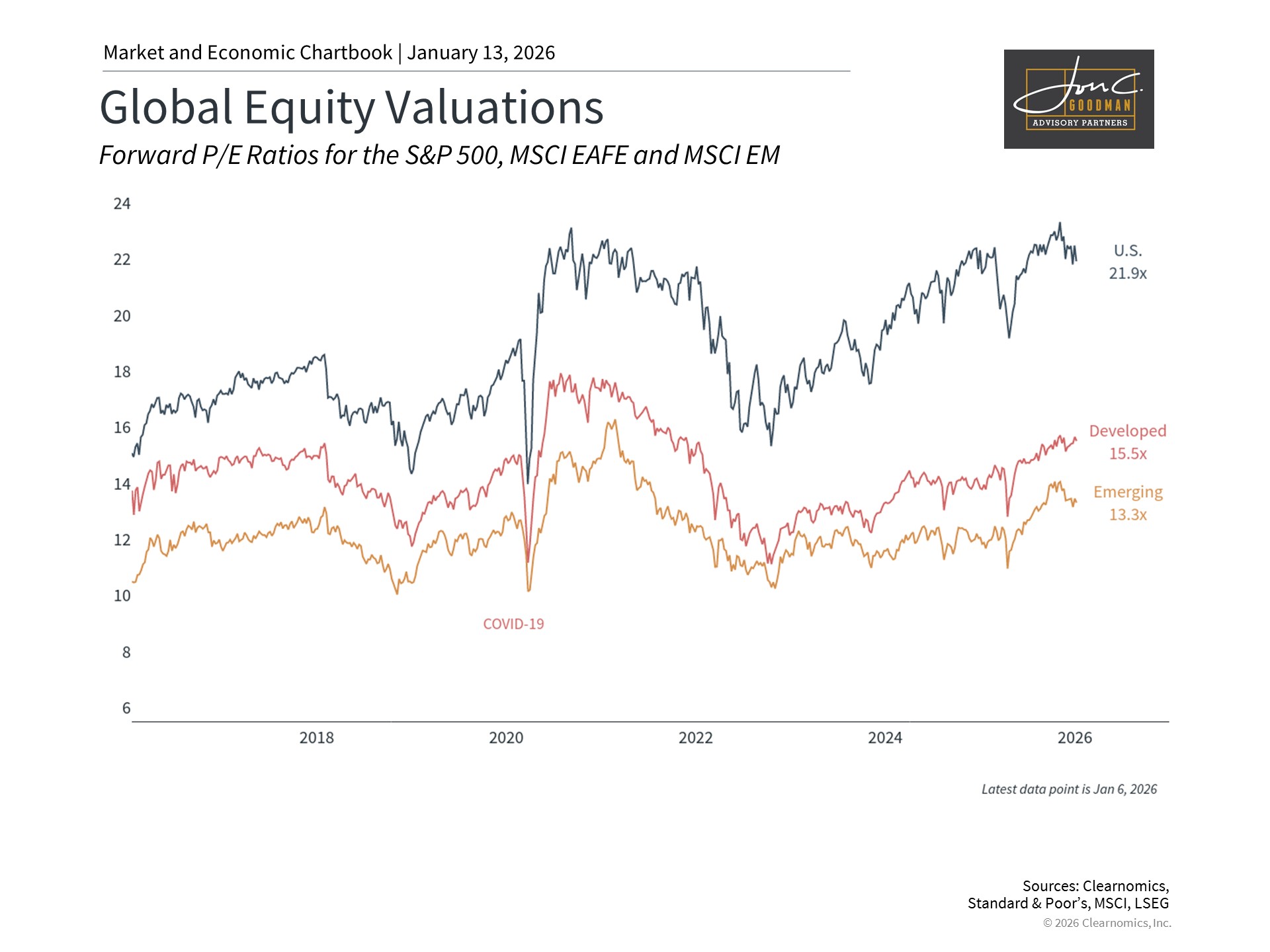 Historical evidence demonstrates that market leadership rotates over time in ways that prove difficult to forecast. The accompanying chart reveals that international markets currently exhibit lower valuations than U.S. equities, potentially enhancing portfolio risk-reward profiles. Effective investing prioritizes consistent performance across complete market cycles rather than maximizing returns in isolated periods.