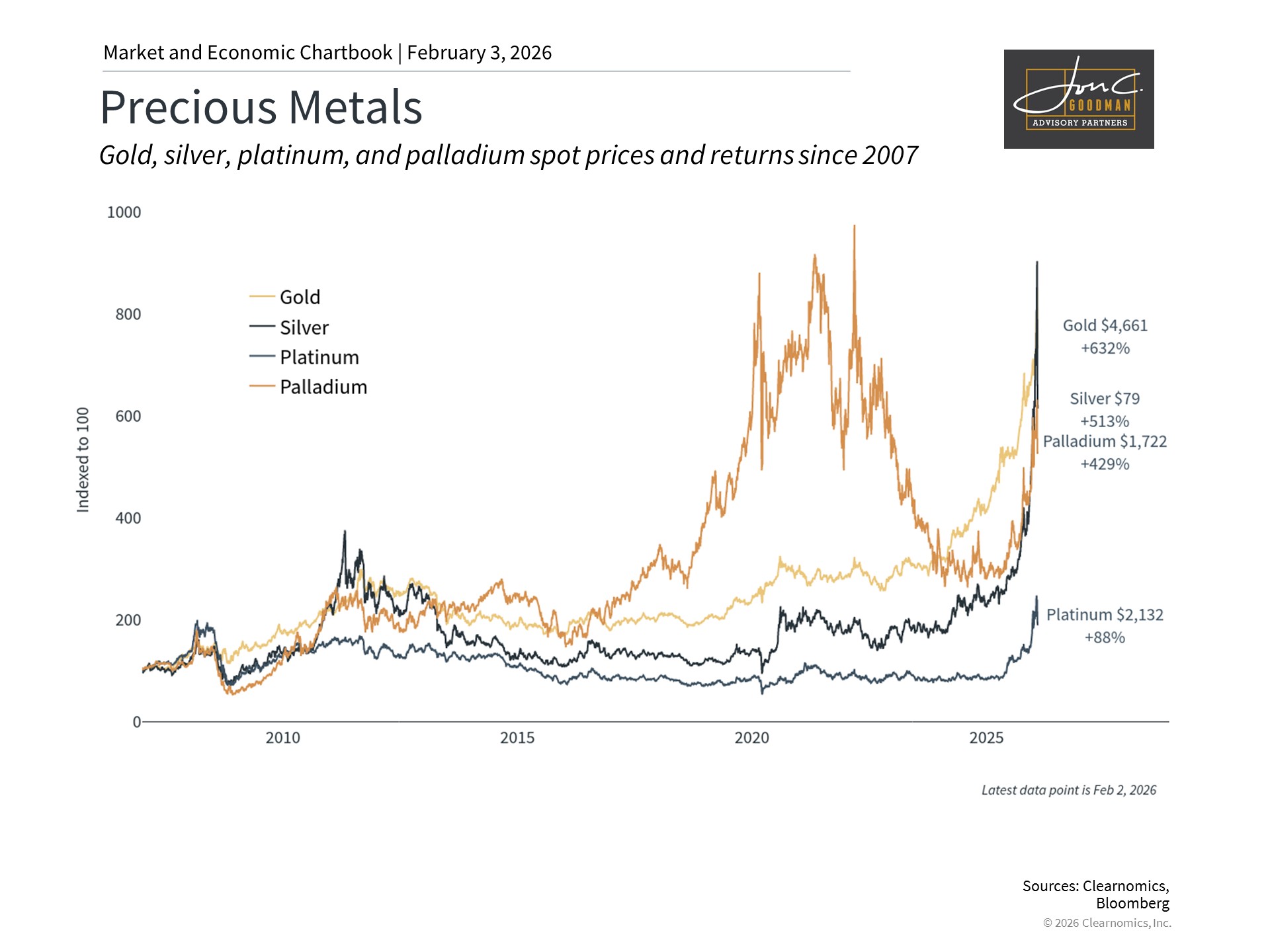 This reversal highlights both the susceptibility of precious metals to boom-and-bust patterns and illustrates how rapidly markets can pivot based on policy expectations. Although precious metals can benefit investors, their volatility throughout January demonstrates why they should complement, rather than substitute for, core allocations in equities and fixed income.