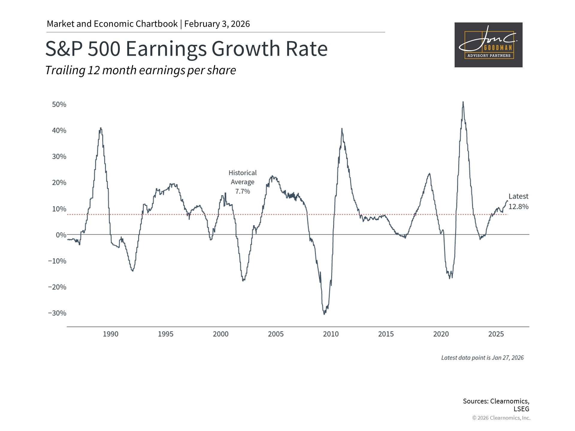 Understandably, numerous investors are monitoring AI and technology earnings given these stocks have driven market returns in recent years. Thus far, markets have responded variably to these companies’ earnings, even when exceeding estimates, reflecting elevated expectations and questions about spending sustainability. Simultaneously, numerous other sectors have benefited from broad-based economic expansion and have expanded their earnings at accelerated rates as well.