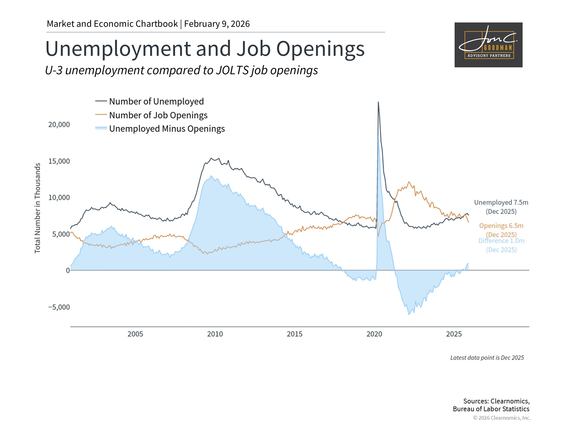 Compounding investor anxiety is a labor market that has softened since mid-2025. Recent Bureau of Labor Statistics data revealed that job openings dropped to their lowest point since 2020 in December. The ratio has shifted from more than two openings per job seeker at its peak to less than one currently, with approximately 6.5 million openings for 7.5 million unemployed workers. Additionally, Challenger, Gray & Christmas reported that January job cuts surged to 108,435, representing a 118% year-over-year increase and the highest January figure since 2009.