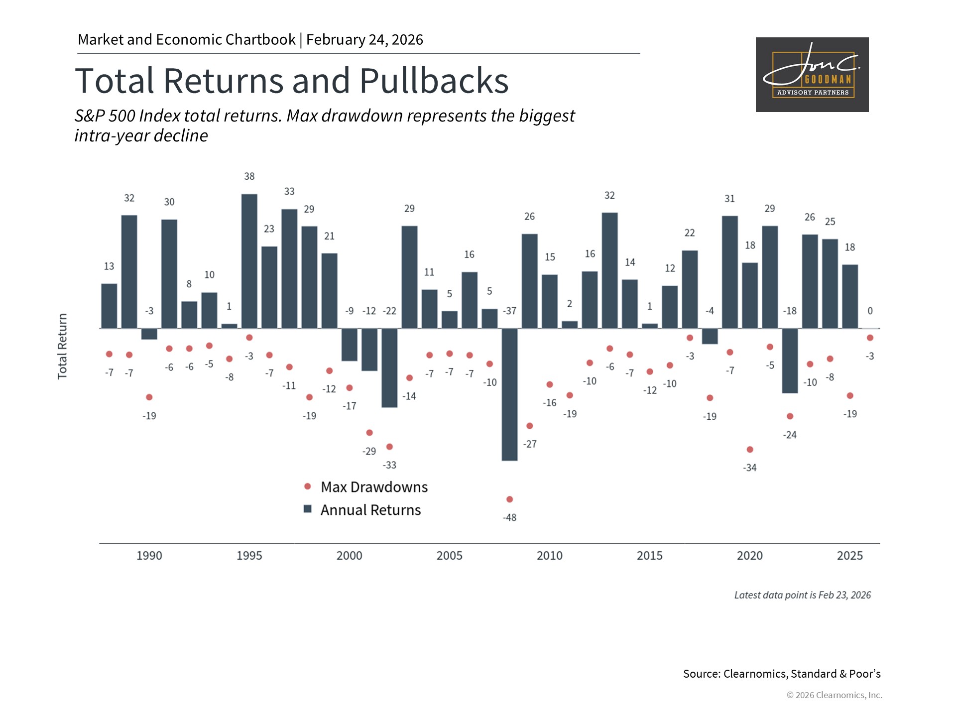 The most evident lesson from the past year of tariff-driven volatility is one that applies to virtually every period of market and policy uncertainty: by far the most effective course of action for investors was to stay invested. Attempting to predict the precise impact of tariffs on the economy and markets is not only difficult but potentially counterproductive. As the accompanying chart illustrates, years that featured significant intra-year pullbacks have very often still concluded with positive returns.